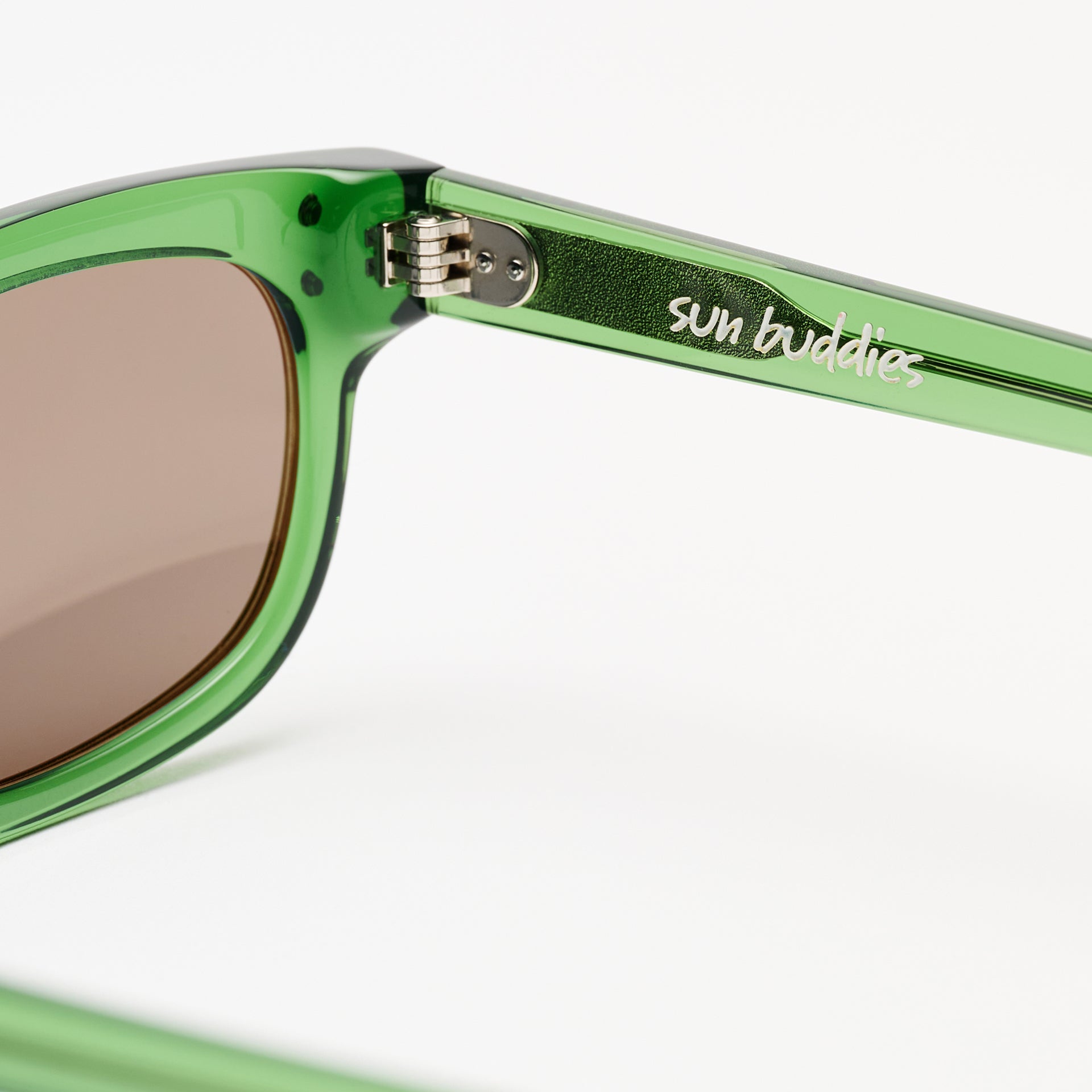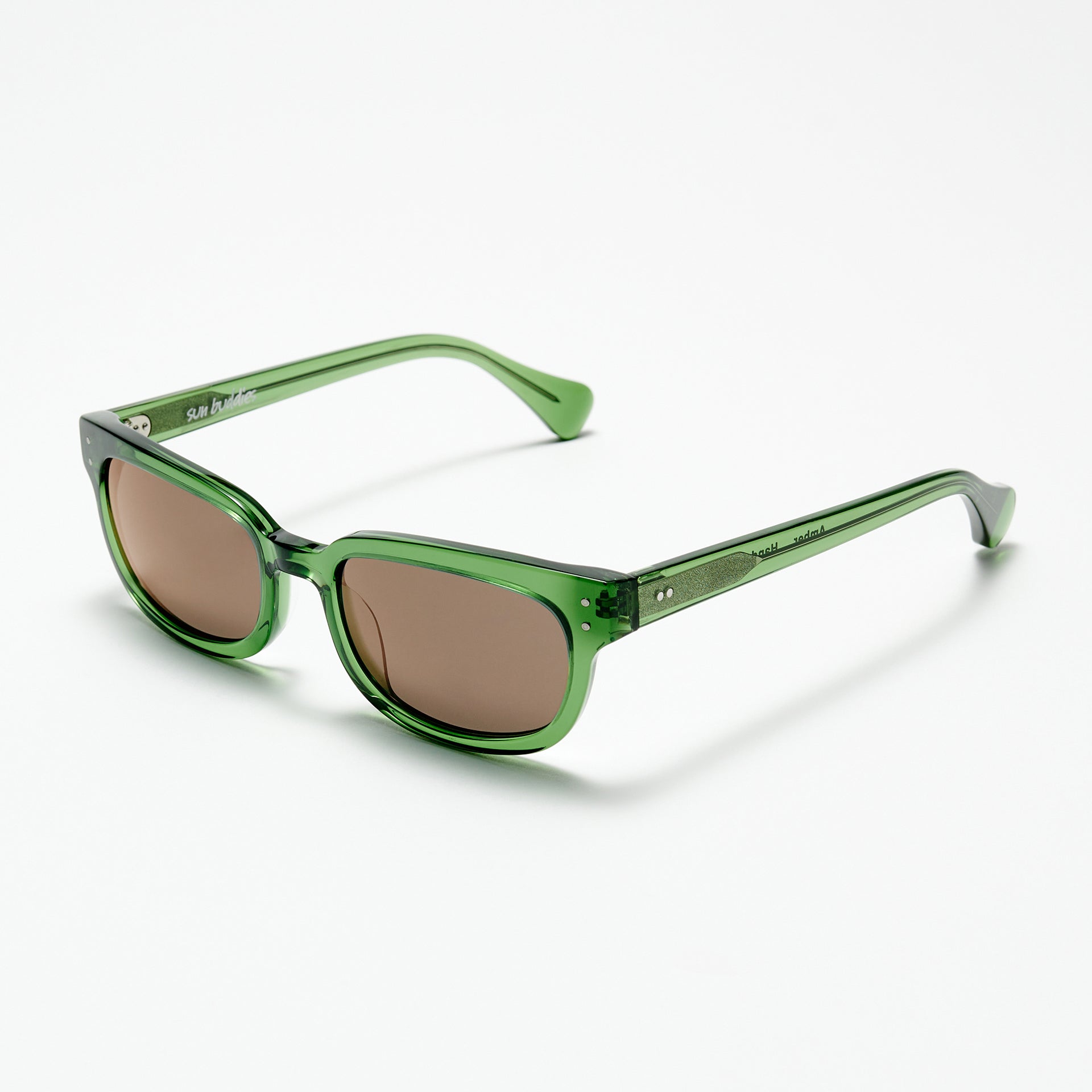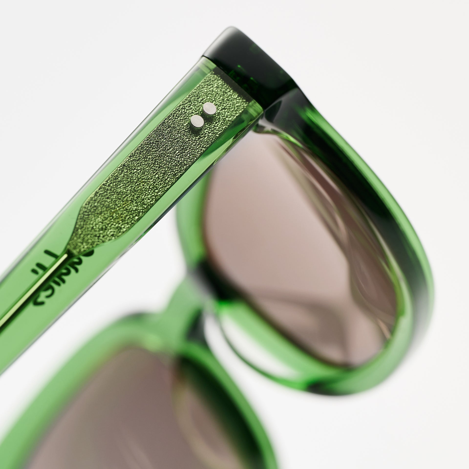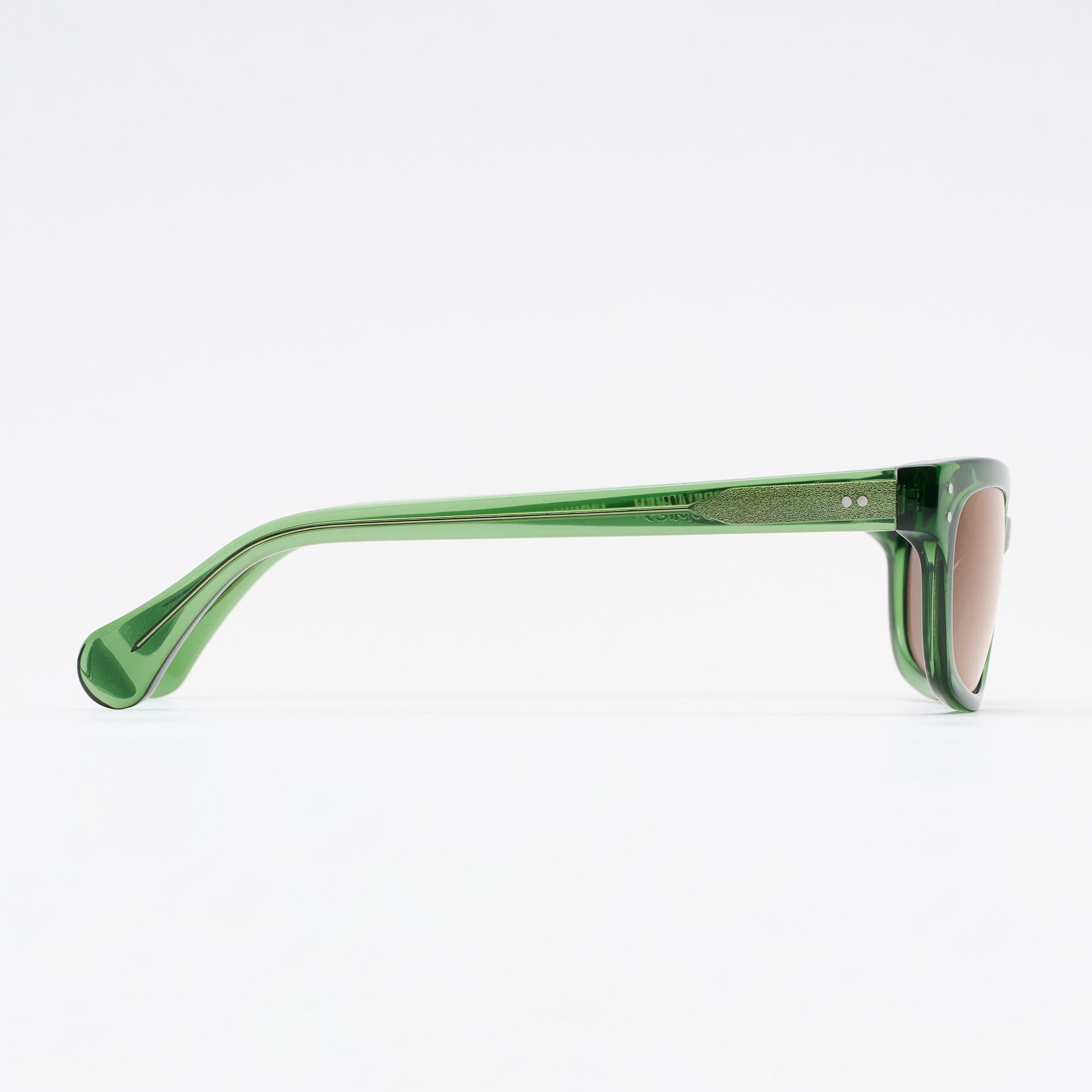 Sunglasses with a slightly thinner, square frame with rounded edges in a transparent bottle green colorway. A narrow version of a classic wayfarer model. Handmade of Italian Mazzucchelli acetate. A seven bar hinge with two visible rivets on the temple. Brown optical class 1 lenses with Category 3 UV 400 protection that covers 100% of UVA and UVB.