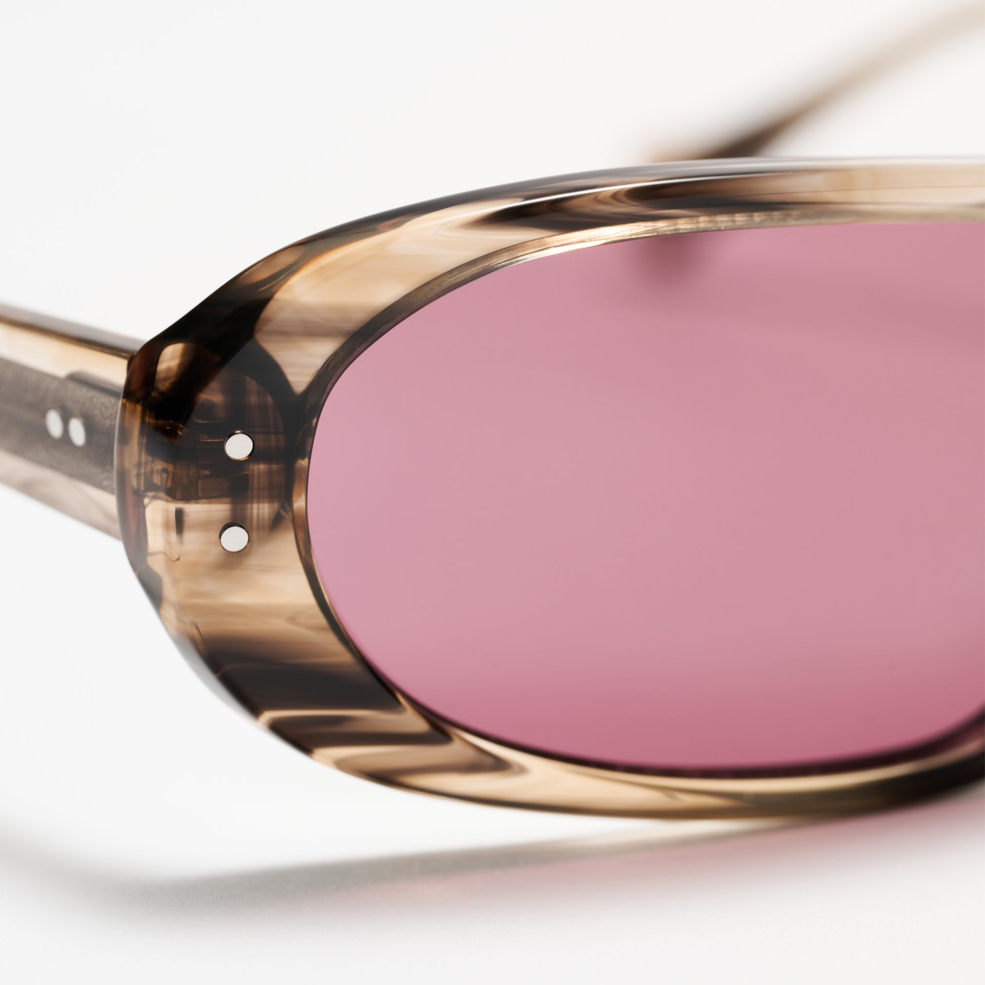 in a smokey pattern. A seven bar hinge with two visible rivets on the temple. Burgundy optical class 1 lenses with Category 3 UV 400 protection that covers 100% of UVA and UVB.